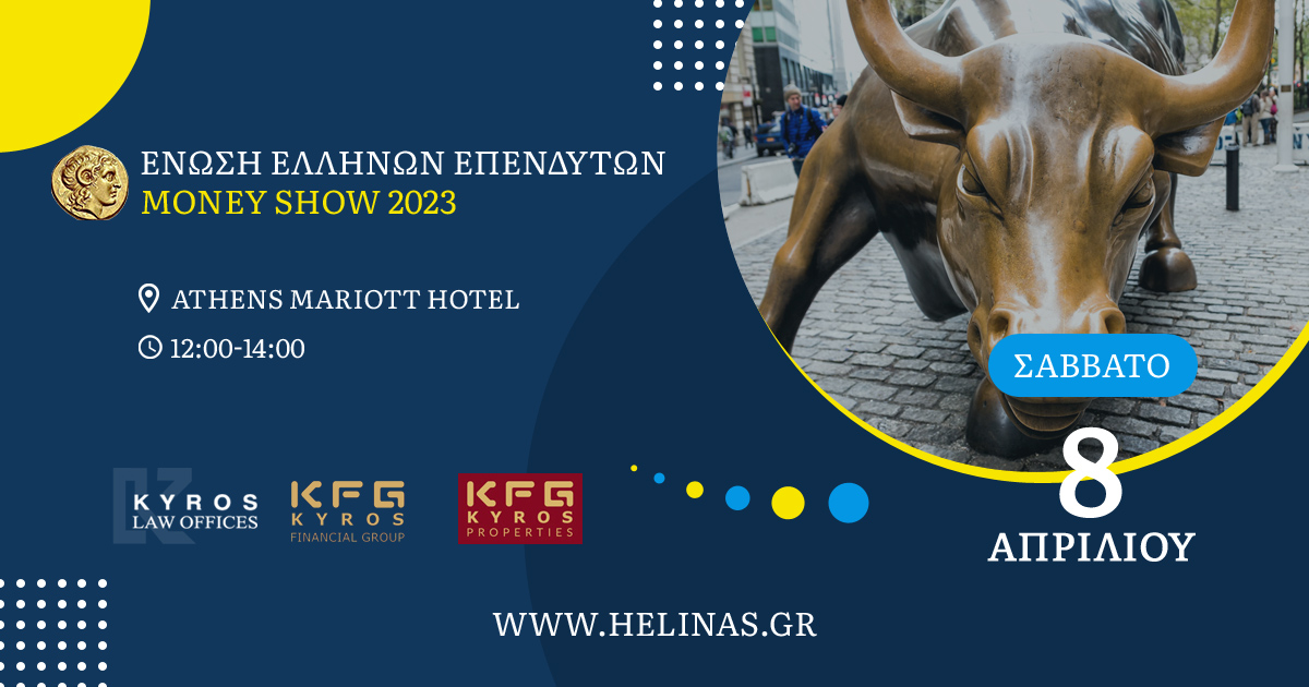 Η Ενωση Ελλήνων Επενδυτών ( www.helinas.gr ) έχει την τιμή να σας προσκαλέσει στην εκδήλωση που θα πραγματοποιηθεί το Σαββάτο 8 Απριλίου 2023 στις 12:00 μμ στην Αίθουσα «ΔΗΛΟΣ» του Ξενοδοχείου Athens Marriott (Λ. Συγγρού 385) και διοργανώνεται στα πλαίσια της διοργάνωσης του Athens Money Show 2023, όπου θα αναπτυχθούν οι ακόλουθες ενότητες: