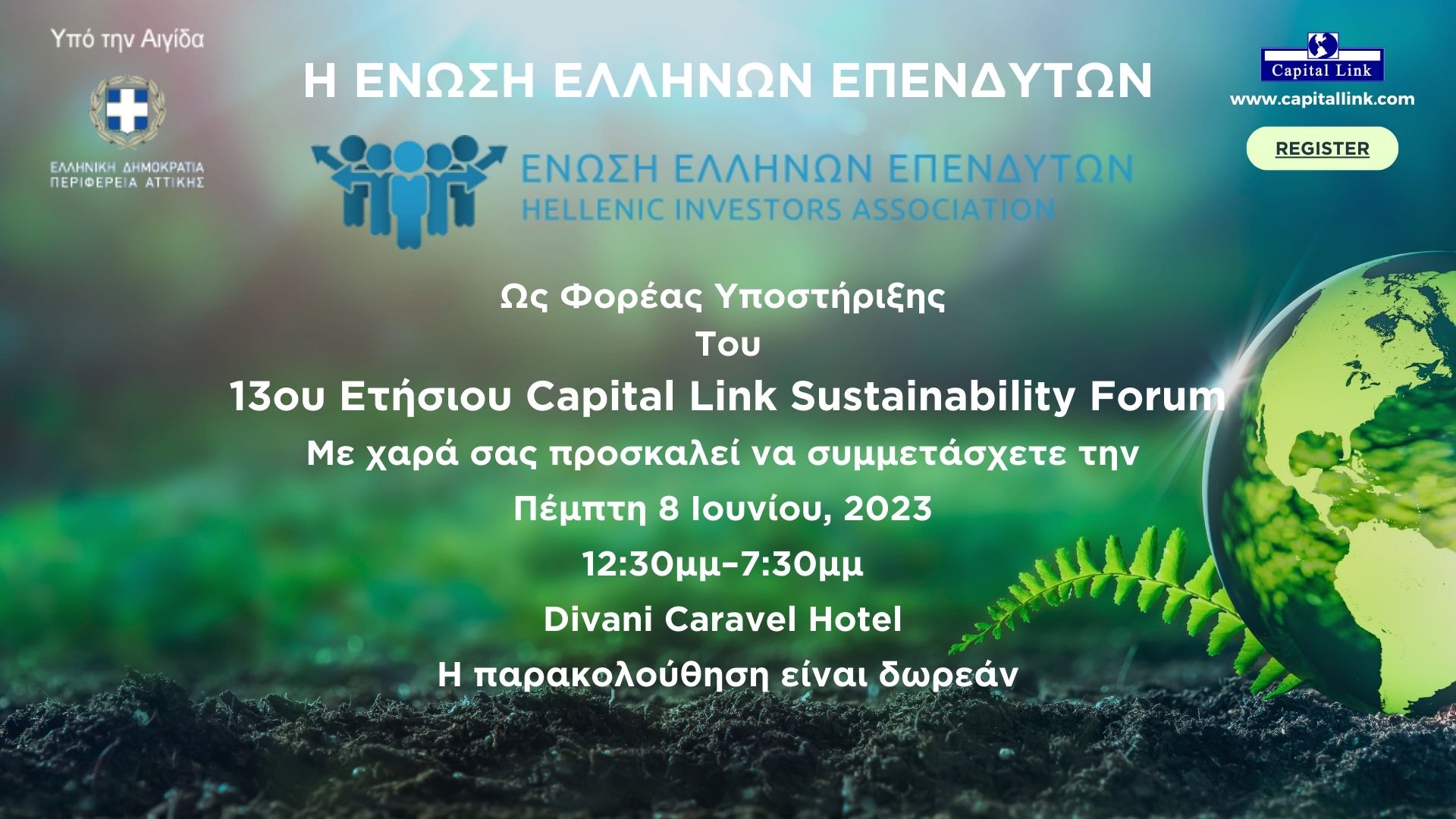 Η Ένωση Ελλήνων Επενδυτών ως φορέας υποστήριξης σας προσκαλεί στο 13ο Ετήσιο Capital Link Sustainability Forum με τίτλο «Χρηματοδότηση, Επενδύσεις & Βιώσιμη Ανάπτυξη», που θα πραγματοποιηθεί με φυσική παρουσία την Πέμπτη 8 Ιουνίου 2023, υπό την Αιγίδα της Περιφέρειας Αττικής, στο Divani Caravel Athens Hotel.