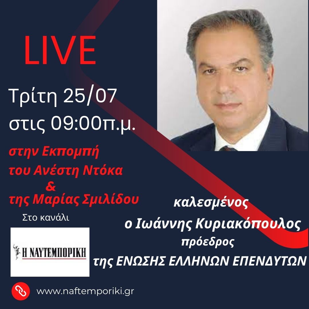 Αύριο Τρίτη 25 Ιουλίου στις 09:00 π.μ. ο Ιωάννης Κυριακόπουλος, πρόεδρος της Ένωσης Ελλήνων Επενδυτών, θα παραβρεθεί ως καλεσμένος στην εκπομπή του Ανέστη Ντόκα και της Μαρίας Σμιλίδου στο κανάλι της Ναυτεμπορικής για να σχολιάσει τα τεκταινόμενα στο Χρηματιστήριο.